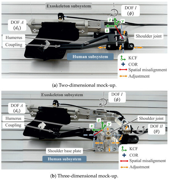 - Yoon, J.; Kim, S.; Moon, J.; Kim, J.; Lee, G. Minimizing Misalignment and Frame Protrusion of Shoulder Exoskeleton via Optimization for Reducing Interaction Force and Minimizing Volume. Machines 2022, 10, 1223. [Google Scholar] [CrossRef]