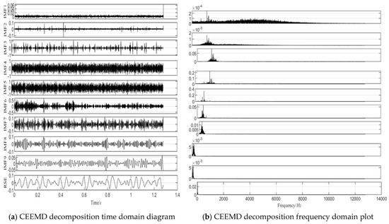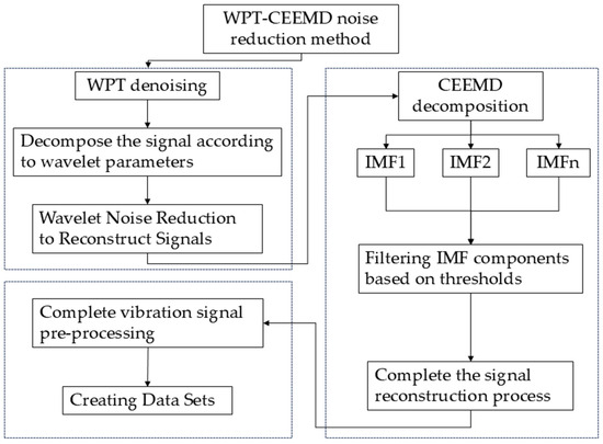 This paper proposes a dual noise reduction method that combines WPT and CEEMD to enhance the accuracy and robustness of the fault feature extraction [25,26,27]. Initially, the collected bearing fault data are processed using WPT, which enables the accurate extraction of fault feature information across different frequency bands and improves the signal’s time–frequency resolution through multiscale decomposition. Subsequently, CEEMD is applied to the processed data, utilizing an adaptive noise-assisted decomposition technique to enhance the stability of the signal decomposition. This ensures that the extracted feature components are purer and exhibit higher separability. Irrelevant noise components are eliminated by decomposing the signal into 10 IMFs and reconstructing the signal based on the correlation coefficient screening principle. By combining the strengths of both WPT and CEEMD, this method effectively removes noise interference, preserves critical fault features, and constructs a more representative dataset, thereby improving the model’s generalization capability and diagnostic accuracy. The specific implementation process is illustrated in Figure 1.