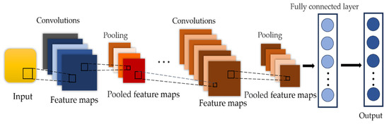 CNNs process input data through multiple layers, typically consisting of an input layer, convolutional layers, pooling layers, fully connected layers, and an output layer [28,29]. Initially, the input layer receives raw data (e.g., images or signals), which are then processed by the convolutional layer to extract local features through convolutional operations, generating a feature map. The pooling layer follows, performing downsampling on the feature map to reduce both the dimensionality of the data and the computational load, while preserving the key features. Afterward, the feature map is flattened and passed to the fully connected layer, where a linear transformation is applied to map the extracted features to the output space. Finally, the output layer produces the prediction results based on the task requirements, often using an activation function for classification tasks. Through this hierarchical structure, CNNs can automatically learn and extract meaningful features from the input data, optimize the model performance via end-to-end training, and achieve strong performance in various complex pattern recognition tasks. The CNN model architecture is shown in Figure 2.