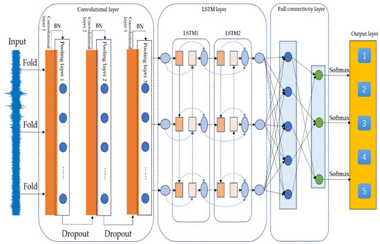 The construction of the CNN-LSTM network includes feature extraction, time-varying learning, and classification decision. Firstly, the data are processed with noise reduction using WPT and CEEMD to improve the signal-to-noise ratio. Then, the CNN extracts local spatio-temporal features and learns bearing fault patterns through convolutional and pooling layers. The CNN-extracted features are then fed into LSTM to capture temporal dependencies and enhance the fault detection. Finally, the fully connected layer is normalized using Softmax to achieve bearing fault classification. Through optimized training, the model can accurately identify fault types and improve the diagnostic accuracy. Figure 4 shows the structure of the proposed CNN-LSTM network. Table 1 shows the neural network structure parameter configurations and learnable parameter variations.