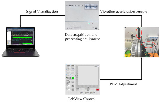 The main test equipment comprises hardware and software configurations, including hardware components (such as various types of sensors, host systems, data acquisition processors, and industrial power supplies) and software systems (including data acquisition software, data management software, middleware communication software, alarm management software, and stand-alone client software). The test platform’s workflow begins by regulating the rotor motor’s rotational speed through LabVIEW software version 2024 Q1. Upon receiving the command, the motor starts running. Subsequently, the vibration acceleration sensor collects real-time vibration data generated by the motor’s rotor, and these data are stored by the data acquisition processor. Additionally, the data acquisition processor is connected to an external computer, enabling real-time data monitoring and visualization, which facilitates the subsequent analysis. The architecture of the entire test platform is shown in Figure 6, and the detailed technical specifications of the vibration acceleration sensor and data acquisition equipment are provided in Table 2.