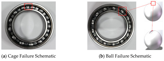 The rolling bearing used in the test is the NSK 6907 deep groove ball bearing (Nippon Seiko Corporation (NSK), Tokyo, Japan). Two fault severity levels—minor and severe—were introduced by implanting defects in the ball and cage components of the bearing to simulate different fault conditions. The precise location of the faulty bearing is illustrated in Figure 5.