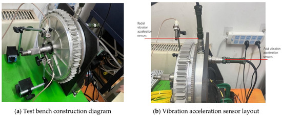 During the experiment, the rotor motor is securely mounted on the test bench, with vibration acceleration sensors strategically placed in both the axial and radial directions to measure the rolling bearing’s vibration response along the x-axis and y-axis (as shown in Figure 9). This sensor arrangement ensures comprehensive vibration signal acquisition and high data accuracy, enabling the precise monitoring of motor vibrations under various operating conditions. This, in turn, provides a reliable data foundation for the subsequent fault diagnosis and performance analysis. The variable speed strategy employed in this test not only closely replicates the dynamic changes in working conditions during actual flight but also accurately captures the rotor’s vibration characteristics at different rotational speeds. As a result, it enables the collection of more comprehensive data, offering robust support for troubleshooting and condition monitoring.