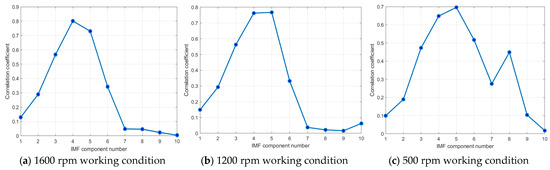 The correlation coefficients of the IMF components in the rolling bearing signals are used to assess the degree of similarity between each IMF component and the original signal, or between different IMF components. The magnitude of the correlation coefficient reflects the energy distribution of the signal across the various IMF components. These correlation coefficients exhibit distinct distribution characteristics under different fault modes. Therefore, the correlation coefficient feature can improve the accuracy of the fault mode identification. Equation (7) is used to calculate the correlation coefficient between each IMF component and the original signal, serving as a basis for selecting the appropriate components [21,22].