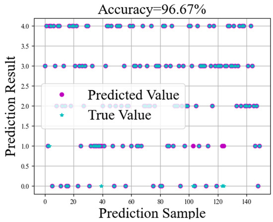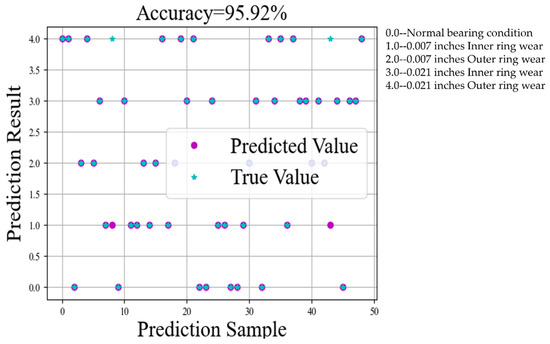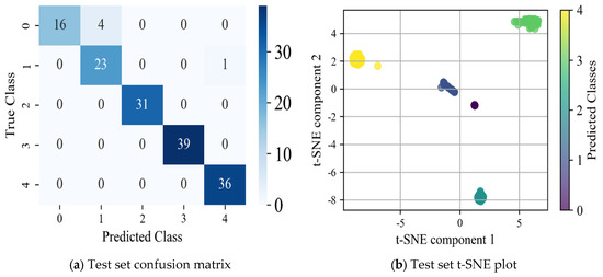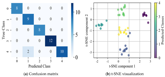 First, the raw vibration signals were preprocessed using WPT and CEEMD to effectively reduce noise and extract high-quality feature datasets. Next, a fault diagnosis model was trained on the processed dataset to enable the classification and prediction of bearing fault types. The experimental results demonstrate that the proposed method achieves high prediction accuracy in fault identification. The specific prediction accuracy is presented in Figure 22, while the confusion matrix and t-SNE visualization results for fault classification are shown in Figure 23.