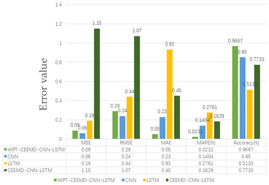 The performance of the four models (WPT-CEEMD-CNN-LSTM, CNN, LSTM, and CEEMD-CNN-LSTM) on the various error metrics (MSE, RMSE, MAE, and MAPE) and the accuracy (Accuracy%) is illustrated in Figure 20. The details are analyzed as follows: