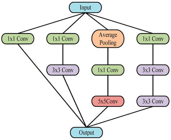 Considering the complex and varied characteristics of bearing signals—including non-smoothness, nonlinearity, and susceptibility to noise interference—neither smaller nor larger convolutional kernels can effectively capture features across all frequency ranges. Consequently, this paper presents a multi-scale convolutional neural network structure (MSCNN) as the foundational framework for modeling. Figure 3 illustrates the multi-scale convolutional neural network (MSCNN) structure proposed in this study. The design is inspired by the concept of multi-scale modeling in the field of computer vision: it integrates parallel convolution kernels from the GoogleNet Inception module for multi-scale feature fusion [42] and employs the 1 × 1 convolution method from ResNet for channel dimension compression [43]. These methods provide the theoretical foundation for the structural design of branches 1–3 in this study. Specifically, the design of the four branches is as follows: first, 1 × 1, 3 × 3, and 5 × 5 convolution kernels are used in branches 1–3, drawing on the inception module’s cross-scale feature capturing concept, while optimizing the kernel sizes for one-dimensional vibration signal processing to achieve multi-scale receptive field fusion. Second, 1 × 1 dimensionality reduction is employed in each branch to improve computational efficiency, inherited from ResNet’s bottleneck design. This reduces the number of parameters while preserving the ability to extract spatial features through convolutions. Additionally, an average pooling layer is included in branch 3 to retain local feature information in a balanced manner. Finally, in branch 4, deep feature enhancement is achieved through the continuous 3 × 3 convolution replacement strategy proposed by VGGNet [44]. Two 3 × 3 convolutions (equivalent to a 5 × 5 receptive field) replace larger kernels, increasing nonlinearity while reducing the number of parameters.