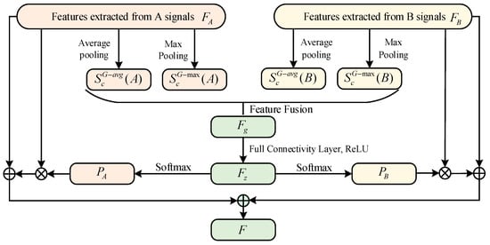 where and denote the global average pooling results of the cth channel of the compressed features of data A and data B, respectively. and denote the global max pooling results of the cth channel of compressed features for data A and data B; L is the total number of elements in the channel (i.e., feature map size, e.g., the width × height of the feature map); M denotes the number of feature channels; and denotes the value of the i-th element of the cth channel.