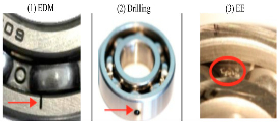 In this paper, we select healthy bearings, three types of outer-ring failures, and two types of inner-ring failures for experimental verification, resulting in a total of six bearing states, denoted as 0 to 5, as shown in Table 1. Specifically, EDM represents artificial damage simulation through electric discharge, while EE represents artificial damage simulation through electric engraving. OR and IR refer to the outer and inner rings of the bearings, respectively. The specific manifestations of the three fault types are illustrated in Figure 7.