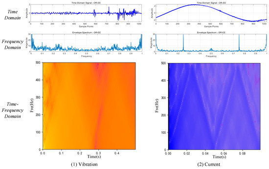To achieve the multi-source fusion previously mentioned, the original time-domain signal samples undergo envelope spectral transformation and Bessel transformation, respectively. The preprocessing pipeline operates as follows: vibration/current signals are bandpass-filtered (Butterworth 5th-order, 1–20 kHz) prior to envelope spectral transformation (EST), which generates frequency-domain features through the Hilbert transform and 1024-point FFT (512 frequency bins). Bessel transformation employs a 6th-order low-pass filter (12 kHz cutoff) to preserve transient impulses. Time-domain features (peak-to-peak, RMS, kurtosis, and crest factor) are extracted from raw 1024-sample segments, while Bessel-based time–frequency maps (128 × 128 pixels) capture the joint time–frequency energy distribution. Each M2IFD input integrates 4 (time) + 512 (frequency) + 16,384 (time–frequency) = 16,900 multi-domain features. The time-domain, frequency-domain, and time–frequency-domain sample intercepts generated from the vibration signal data of the outer ring electrodynamic sculpture and the single-ended current signal under the selected operating condition A are presented in Figure 8. The frequency-domain signal image, which was transformed by the envelope spectral transformation, is shown for the convenience of displaying the zoomed-in segment from the intercepts.