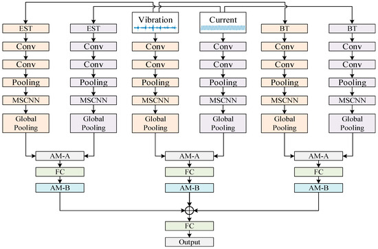 The input signals consist of both vibration and current signals. For each signal, the model extracts and fuses features across three distinct domains: time, frequency, and time–frequency. Each domain subsequently compresses the spatial dimensions of the features through global pooling, resulting in a comprehensive global feature representation. In this step, the features of each domain of each signal are extracted and used as input for subsequent fusion. Subsequently, the multi-source data from each domain is fed into the multi-source feature fusion module AM-A. This process yields the fused feature outputs of the vibration and current signals across the three domains, which are then further compressed and tightly mapped by the fully connected layer. This is followed by the multi-domain feature fusion module AM-B, which employs an attention-based weighting mechanism to dynamically assign domain importance weights. Specifically, for features from the i-th domain, the weight is calculated as follows: