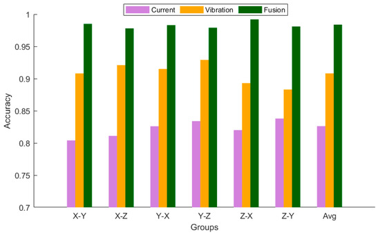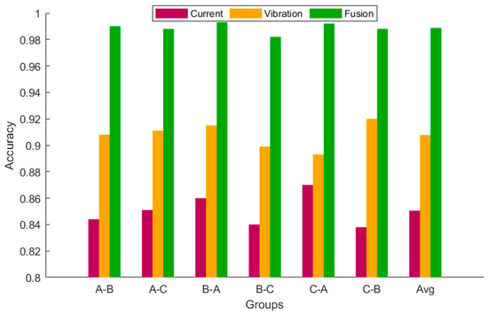 Analogous to Case 1, the initial comparative experiment involves a multi-source data comparison, in which data from individual sensor types are input separately as well as in combination. Figure 16 and Figure 17 illustrate the comparative histograms and confusion matrices of the experimental results, respectively. The findings reveal that the accuracy is 82.62% for current signals and 90.81% for vibration signals when input individually, which is markedly lower than the 98.38% achieved with combined inputs. This underscores the significance of integrating data from multiple sources to enhance the performance and reliability of diagnostic models. Therefore, for applications that demand high accuracy, prioritizing the use of combined sensor data over reliance on data from a single source is advisable.
