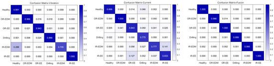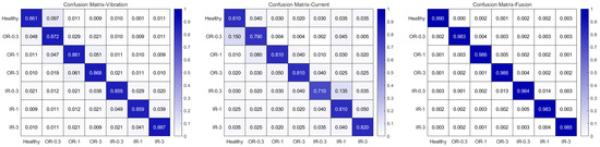 The first comparative experiment conducted in this study is a multi-source data comparison experiment, implemented as follows: first, the raw time-domain data from the vibration and current signals are utilized separately and input into the feature extraction module for experimental analysis. Subsequently, the data from the vibration and current signals are fused and analyzed through the feature extraction module and the multi-source feature fusion module. The comparative histograms of the experimental results are presented in Figure 10. Additionally, the experimental results are visualized using a normalized confusion matrix, where each row represents the proportion of samples within a given category predicted to belong to each category. The results of this experimental confusion matrix are shown in Figure 11.