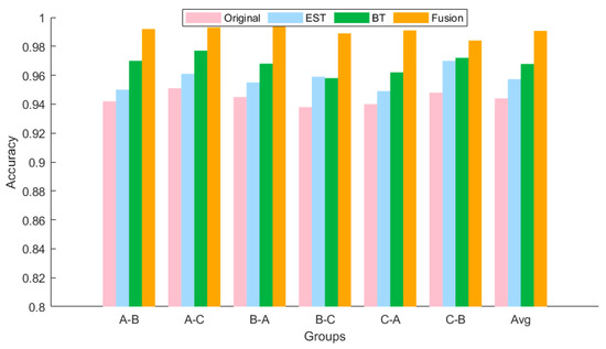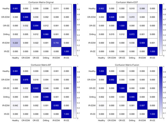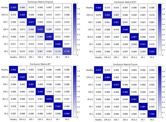 The second comparative experiment involves a multi-domain data comparison. This experiment evaluates the impact of multiple transformation domains on the model by comparing the outcomes of using single-domain features against those achieved by fusing multi-domain features. Figure 18 illustrates the comparative histograms of the experimental results, while Figure 19 presents the confusion matrix. The findings reveal that the accuracy is 92.07% without domain transformation. With envelope spectrum transformation and Bessel transformation, the accuracy rises to 94.25% and 94.9%, respectively. Nevertheless, the highest accuracy of 98.9% is attained when multi-domain data are fused. This corroborates the conclusions drawn in CASE 1, demonstrating that acquiring information from multiple transformed domains offers a more comprehensive representation of the data, thereby enhancing the robustness and reliability of the diagnosis. Consequently, integrating multi-domain data should be regarded as a critical step in developing high-precision diagnostic models.