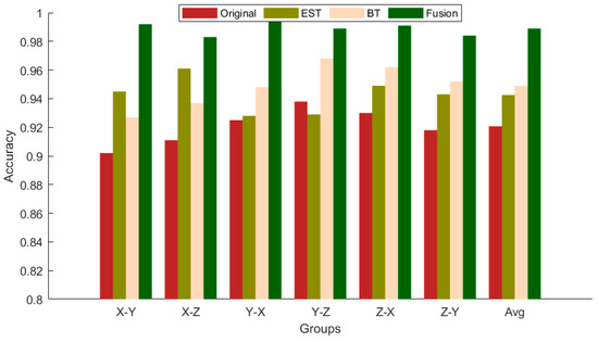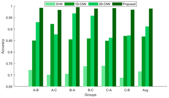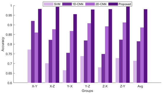 To ensure fair and effective comparative experiments, the following classical methods are selected and evaluated under uniform experimental conditions in this study: (1) SVM: by employing Empirical Mode Decomposition (EMD), the vibration and current signals are decomposed into Intrinsic Mode Functions (IMFs). The kurtosis values of the first five IMF components are extracted as feature vectors and input into a Support Vector Machine (SVM). A kernel function is utilized to map the data into a high-dimensional space for model training, ultimately achieving fault classification. (2) 1D-CNN: integration of features from multi-source data at specific fusion points. (3) 2D-CNN: time–frequency domain features are extracted from images using a 2D convolutional network after converting time-series data into 2D grayscale images, followed by data fusion performed in the image space. To ensure fairness in the model comparison experiments, a uniform dataset, consistent sample division, and identical hyper-parameter settings are employed, with the results presented in the histogram shown in Figure 14.