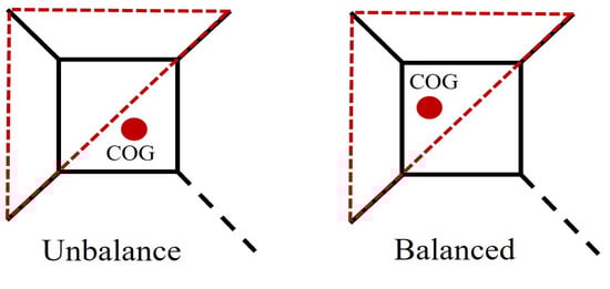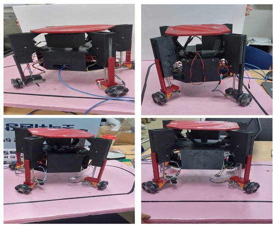 The creeping gait, a movement pattern for the proposed system, necessitates that a minimum of three wheels maintain contact with the ground continuously. The fourth wheel, linked to the linear RC servo actuator, advances using either quadrilateral or triangular support configurations []. In this research, we employed the creeping gait technique with a triangular support pattern for ascending stairs, illustrated in Figure 3.