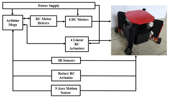 Figure 4 illustrates the control structure of the proposed system. It comprises several components, including a joystick module, an Arduino Mega microcontroller, four DC motors, DC motor drivers for the motors, a sensor shield, one rotary RC servo actuator, two Inertial Measurement Units (IMUs), four linear RC servo actuators, and a lipo power battery. We used four IR sensors, with one sensor attached to each leg to measure the height between the wheel and the ground, and another IR sensor to measure the distance from the body of the robot to the stair to confirm to the robot before starting the procedure for overcoming this stair. To construct the robot, 3D printing technology was utilized, employing polylactic acid (PLA) material for the mechanism parts.