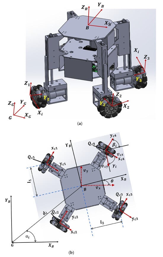 The four omni-wheeled mobile robot configuration is shown in Figure 5. The fixed reference frame of the robot is denoted as , G, , while , B, represent the reference frame associated with the mobile robot’s center of mass. In Figure 5a, each wheel has its coordinates. The x-axis represents the movement direction, the y-axis is the rotation axis about which the wheel rotates, and the z-axis represents the variable height of the linear actuator. Additionally, each wheel has a reference frame , , and , where , as shown in Figure 5b. The model described here has been thoroughly investigated in the literature of []. We begin by describing the velocity of the wheel in terms of its associated reference frame , , .