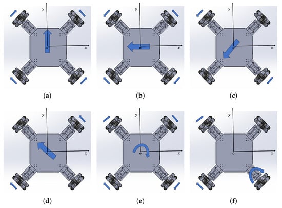 In Figure 6, the primary movements of an omni-wheeled robot are depicted in all directions. The side arrows indicate the wheel drive direction, while the central arrow shows the omni-wheeled robot’s moving direction. By independently setting the velocity and direction of each wheel, and maintaining the same velocity for all wheels simultaneously during operation, this robot can move in any direction without rotations. To move the robot forward, all four wheels were rotated in the same direction, as depicted in Figure 6a. To achieve lateral motion to the left, the left wheels were rotated inward against each other, while the right wheels were rotated outward against each other, as illustrated in Figure 6b. To move the robot diagonally at a 45° angle, the two wheels in the same direction were rotated in the same direction, while the other two wheels had a speed of zero, as shown in Figure 6c,d. To rotate around the center of the robot, the two right wheels were rotated in the same direction, while the two left wheels were rotated in the opposite direction, as shown in Figure 6e. The robot can rotate around the corner, as shown in Figure 6f. Additionally, to achieve a rotational motion between 0° and 360°, we adjust the speed of the diagonal wheel.