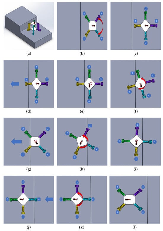 Video capture: simulation results of stair-climbing performance: (a) isometric view of initial position, (b) top view of initial position, (c–k), sequence steps of climbing the step procedures, (l) finally the robot climbs the step.