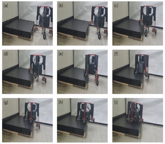 Video capture: experimental results of stair-climbing (single step) performance of the proposed robot: (a) initial position, (b–h), sequence steps of climbing the step procedures, (i) finally the robot climbs the step.