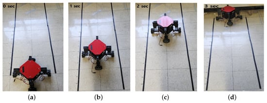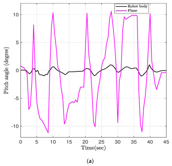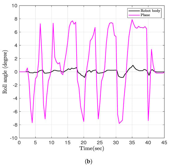 In frame (f), two wheels will remain in contact with the surface of the stair step, while the third wheel will be on the ground. This adjustment ensures stability and effective climbing of the stairs. In frame (g), following the adjustments in frame (f), the robot will make a counterclockwise turn. This maneuver will position three wheels in contact with the surface of the stair, ensuring stability and effective climbing. After the counterclockwise turn in frame (g), the linear RC servo actuator will begin to move upward, and simultaneously, the rotary RC servomotor will rotate to adjust the center of mass within the triangular region formed by the three wheels on the surface of the stair. This adjustment is depicted in frame h. After the adjustments in frame (h), the robot will proceed to move straight forward. This will be the final stage, where the robot successfully completes the climbing of the stairs. This stage is represented by frame (i). The experimental results for the linear motion are depicted in Figure 9, which showcases the captured video of the robot moving at a speed of 0.12 m/s. To control the robot’s body while dealing with external disturbances, we have conducted an experiment to evaluate the performance of the proposed robot. The robot was placed on a plate, and the disturbance was introduced by changing the angle of the plate, as shown in Figure 10. Two IMUs were used to measure the roll and pitch angles. The first IMU sensor was mounted inside the robot body, and the second IMU sensor was mounted on the plate. As shown in Figure 5a, the z-axis represents the variable height of the linear actuator, and we have four linear RC actuators with variable stroke length. When we apply a disturbance by changing the angle of the plate while needing to keep the robot body stable with roll and pitch angles being equal to zero, the stroke length of each linear RC actuator will change to guarantee this stability. As shown in Figure 11, the system is able to adjust the roll and pitch angles in response to orientation disturbances, effectively countering the disturbances and reducing the deviations at both angles to nearly zero.