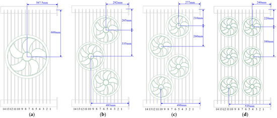 Figure 11a–d illustrate the mass flow rate distribution of the insulating oil within the first to fourteenth radiator fins in different cases (Cases 0–3). For Case 0 (single-fan horizontal blow) in