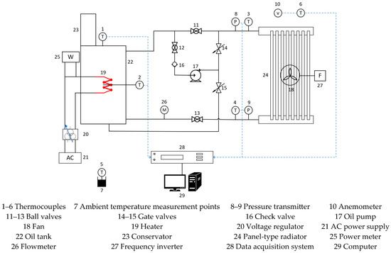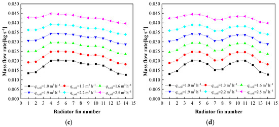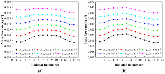 Figure 11a that the oil flow rate of the fins near the inlet of the manifold (fins 1–7) is slightly higher than that at the other end (fins 8–14). On the one hand, the flow path of the radiator fins near the oil inlet is shorter, the flow resistance is smaller, and the oil flow rate is larger. On the other hand, the fins near the oil inlet are closer to the oil inlet of the upper manifold, the average oil temperature is higher, the total heat dissipation is greater, and the thermosiphon effect is stronger. With the increase in