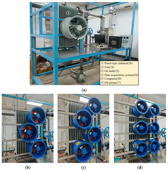 Figure 9c,g,k, on the one hand, the two fans near the oil inlet are located at a higher position, where the insulating oil at this position has a larger temperature difference with the environment, resulting in stronger heat dissipation. On the other hand, the fins with smaller serial numbers are closer to the oil inlet of the manifold, which also leads to enhanced heat dissipation performance. Finally, in