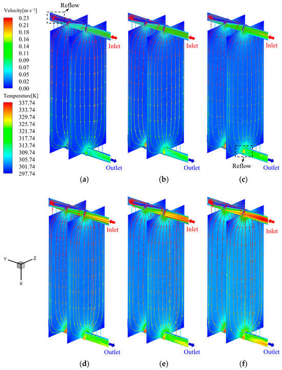 Figure 7a–f, the velocity distribution and the streamline within the fifth and tenth fins of the panel-type radiator for different inlet oil flow rates (