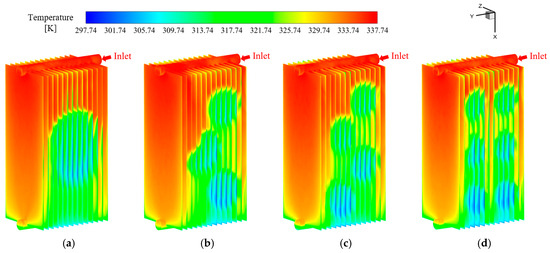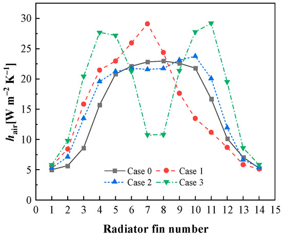 −1) are given. It can be clearly found that the air blown by the fans exchange heat with the surface of the radiator fins as it passes through the airflow channel between the fins, resulting in a gradual increase in air temperature. Subsequently, when the air flows out of the channel between the fins, the air temperature gradually decreases and eventually approaches the ambient temperature. Furthermore, it can be observed in