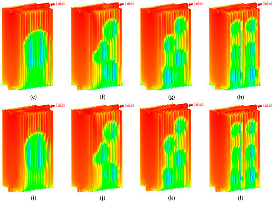 Figure 8d,h,l separately, it can be found that as the flow rate of the insulating oil gradually increases, the temperature difference between the inlet and outlet of the heat sink decreases. Moreover, under the same fan arrangement conditions, the diffusion distance of the local low-temperature zone gradually decreases. This is because, at a lower oil velocity, the higher-temperature insulating oil remains in the fan blowing area for a longer time, which allows for a more effective heat dissipation. As the oil flow rate increases, the insulating oil inside the radiator (especially the insulating oil near the leeward region) can not fully dissipate heat before flowing out of the fan coverage region. Subsequently, the lower-temperature insulating oil near the windward region mixes with the higher-temperature insulating oil near the leeward region, causing the wall temperature to rise again. Therefore, in