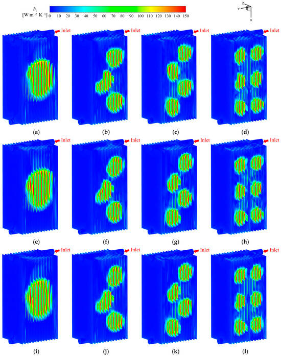 Figure 9a–l, there is a local region with a high convective heat transfer coefficient on the windward region of the panel-type radiator that corresponds to the number and location of the fans. Since these regions are directly covered by horizontal blowing fans, it indicates that these side fans enhance heat dissipation in these regions. The area directly covered by the fan (at the lateral of the radiator) is subjected to jet impingement, and the boundary layer is obviously thinned, especially among these regions. Therefore, the local convective heat transfer coefficient at this location is significantly higher than in other surrounding regions. It is worth mentioning that the phenomenon of high heat dissipation performance zones diffusing along the positive