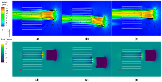 Figure 13a–d, the airflow velocity is further reduced. It is noteworthy that in