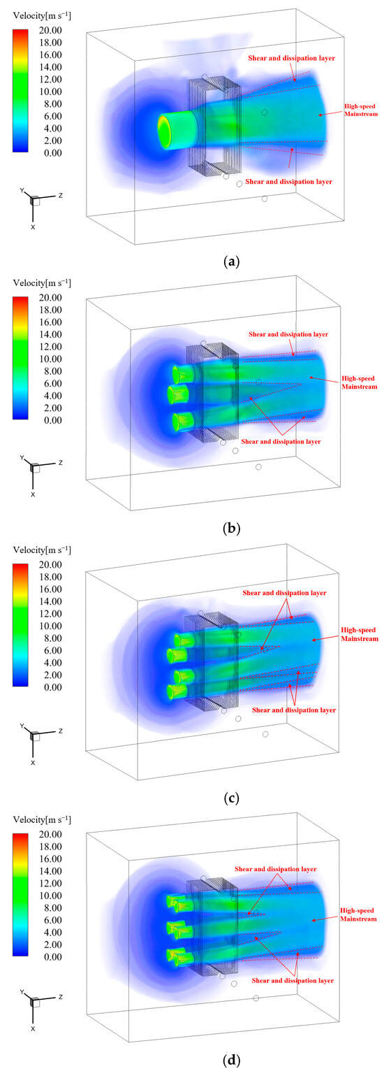 Figure 13b–d that the high-speed airflow generated by different fans merges downstream of the main flow, which is consistent with the phenomenon of intermixing of air shear dissipation layers in