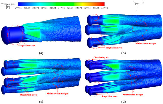 Figure 8a–d reveals that in Case 0, due to the largest local fan-blowing area, the enhanced heat dissipation region of the fan is more concentrated, resulting in the longest diffusion distance of its localized low-temperature region in the