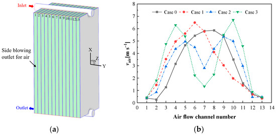Figure 14b, airflow channels 2–11 have a higher average outlet air velocity, while the twelfth airflow channel has a relatively lower air velocity because it can only be blown by the outermost part of a single fan. Because of a larger blowing area near the manifold inlet and outlet, the