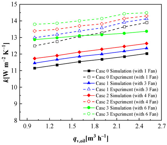 k) of the panel-type radiator under different inlet oil flow rates in Cases 0–3 is given. In this figure, the experimental results consistently exceed the numerical simulation results for the same operating conditions. This discrepancy can be attributed, on the one hand, to the simplification in the numerical simulation, where the radiator fins with multiple oil flow channels are modeled as thin rectangular solids, failing to fully capture the detailed flow and heat transfer characteristics inside and outside the fins. On the other hand, a steady-state numerical model for simulating the fan flow is used in this study; it also introduces some computational deviation. Overall, the maximum relative deviation (