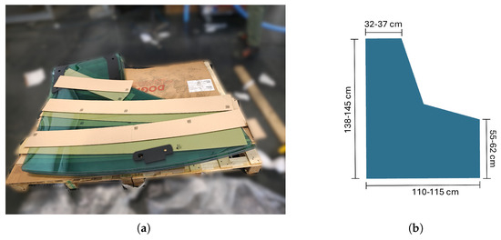 There are many workstations in the logistic site, and for this project, we concentrate on the windshield refinement workstation. The largest windshield picture is available in Figure 2a, while the rough windshield shape is in Figure 2b. It is not possible to provide the precise measurements of the windshield due to the confidentiality constraints regarding proprietary data from the client; for this reason, in Figure 2b, a range of measures are reported.