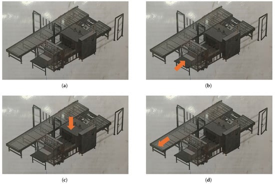 Packing machine. (a) Packing machine layout. (b) The arrow indicates the product position at the beginning. (c) The arrow indicates the packing machine position. (d) The arrow indicates the product position at the end.