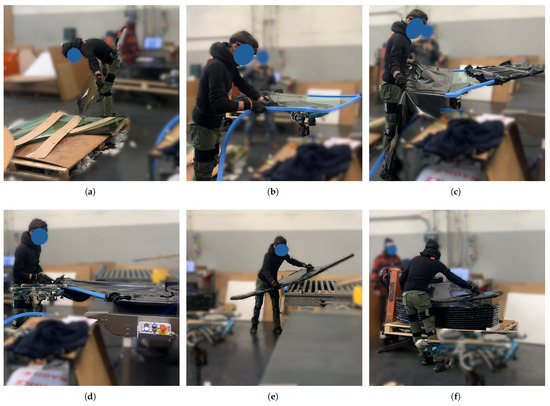 Windshield refinement workstation tasks. (a) The operator lifts up the windshield from the pallet. (b) The operator applies a protective foam border. (c) The operator wraps the windshield. (d) The operator puts the windshield onto the conveyor. (e) The operator lifts up the windshield from the conveyor. (f) The operator puts the windshield on a pallet.