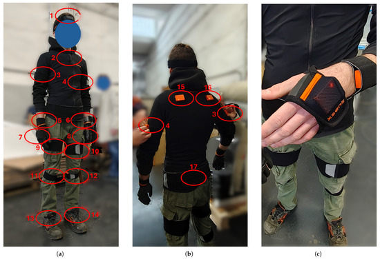 Operator wearing 17 Xsens sensors. (a) Front of the operator with the visible 14 Xsens sensors. (b) Back of the operator with the visible 5 Xsens sensors. (c) Detail on operator’s hand wearing Xsens sensor.