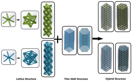 Each hybrid structure is composed of ten rows of cellular elements and is transformed into 50 mm-long structures. The wall geometry of the hybrid structures consists of a square structure with a side length of 15 mm and a hexagonal structure with a side length of 10.6 mm. The lattice structures were characterized as homogeneous and symmetrically placed and stacked in the tube to meet loads evenly and gradually.