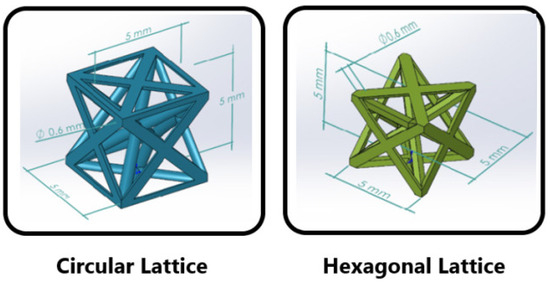 The design parameters for a healthy and correct product that can be produced with the additive manufacturing method were as follows: cell element diameter 0.6 mm and thin wall thickness 0.5 mm. The cellular structure formed by cell elements was designed as a 5 mm cube with 5 mm height and 5 mm × 5 mm width-length dimensions (Figure 3). The cell elements were placed symmetrically and at equal angles. During the design process, the angles and diameters of the element rods were maintained constant while the geometry transitioned from a circular to a hexagon configuration.