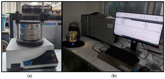 (a) Dry sieve device for particle distribution analysis, (b) laser diffraction particle size analyzer.