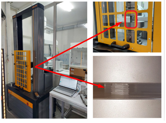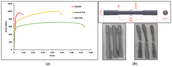 Tensile specimens were prepared in accordance with the ASTM E8/E8M standard [48] to obtain the material mechanical properties of the additive manufactured specimens, and tensile tests were performed at a speed of 3 mm/s using a UVE MRN200 universal testing machine (UVE Measurement Equipment-Nilüfer/Bursa, Türkiye) with 200 kN tensile capacity and 0.001 mm/min test speed. The actual stress-strain and tensile specimens for all three materials and testing equipment are shown in Figure 6.