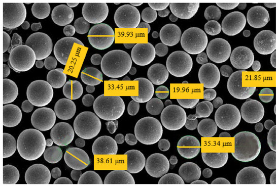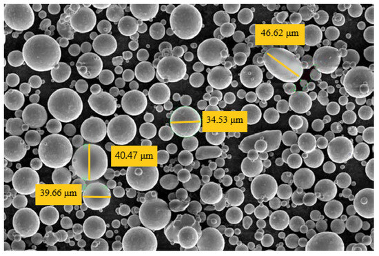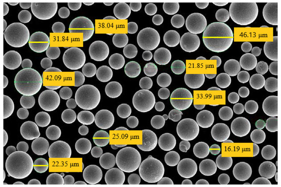 The microstructure of the Inconel 718 powder used in this study was analyzed by electron microscopy, shown in Figure 9. The powder exhibited a grain size ranging from 15 to 45 µm, a spherical grain geometry, and sufficient surface roughness. The ability of the material to maintain a homogeneous structure is attributed to the spherical grain geometry.