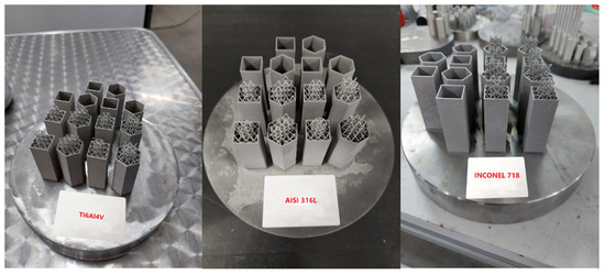 The specimens were designed using Computer-Aided Design (CAD) software according to the test matrix and were then 3D printed using the selective laser melting (SLM) method as a whole on an additive manufacturing machine. Powder materials of Ti6Al4V, AISI 316L, and Inconel 718 were selected for the fabrication of the specimens. The SLM process was carried out with an Enavision 165 additive manufacturing machine (Ermaksan Makina Sanayi ve Ticaret A.Ş.—Nilüfer/Bursa, Türkiye, https://www.ermaksanadditive.com/tr-TR/3d-yazicilar/enavision-165, accessed on 10 March 2025) with a 300 W fiber laser and a laser beam diameter of 85 μm. The optimum data determined by the manufacturer and vary according to the properties of the material are listed in Table 11. The production parameters of 2100 layers, 30 μm layer thickness, and 100 μm scanning interval are the same for all materials.