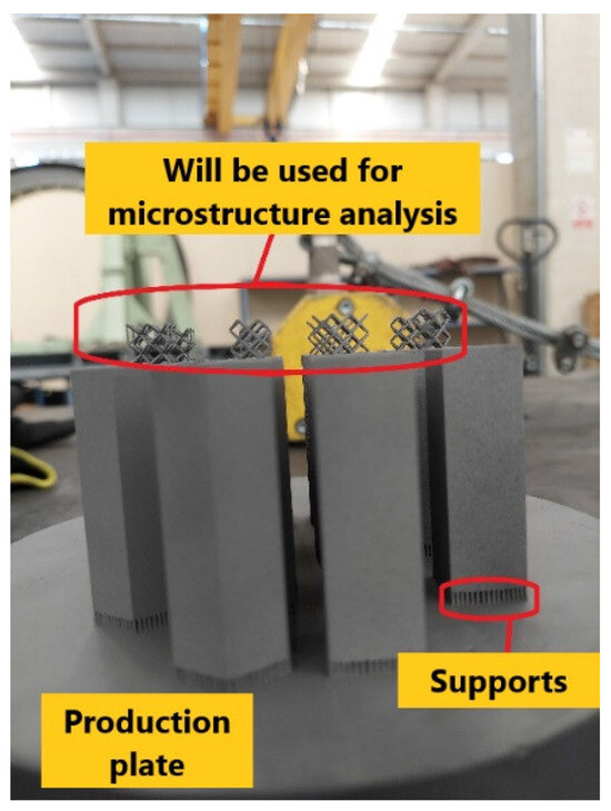 After shot blasting, the fabrication supports of the shot blasted specimens shown in Figure 11 and the lattice structure prepared for microstructure analysis were separated from the fabrication table using a wire erosion machine. These components were then separated from the samples. Thus, the manufacturing process of the part was completed.