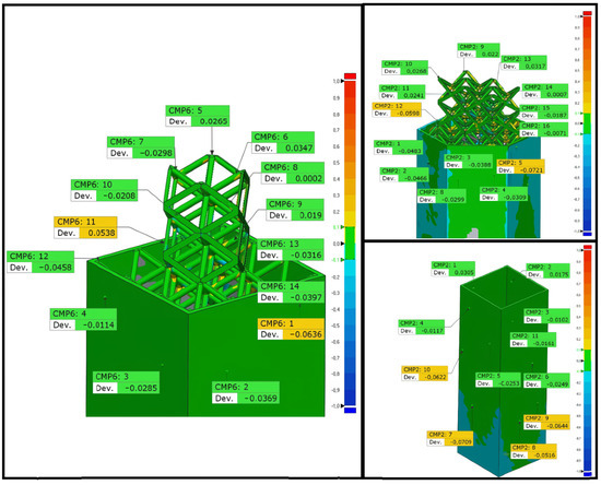 Samples of all three materials were scanned using a FaroArm (Faro Technologies—Lake Mary, FL, USA, https://www.faro.com/en/Products/Hardware/Quantum-FaroArms accessed on 10 March 2025) Quantum M ScanArm 3D laser scanner with a scan deviation of 0.046 mm. The scanned data were processed using ControlX software (https://oqton.com/geomagic-controlx/ accessed on 10 March 2025), and dimensional checks were performed. Figure 13 shows examples of dimensional checks; according to the color map generated with a tolerance of ±0.1 mm, the regions shown in green are within the tolerance range of ±0.1 mm. Deviations in the wall structure were generally in the range of ±0.07–0.004, while deviations in the cell element were found in the range of ±0.05–0.01. As a result, it was determined that the manufacturing process was successful, and the dimensions were within tolerance.
